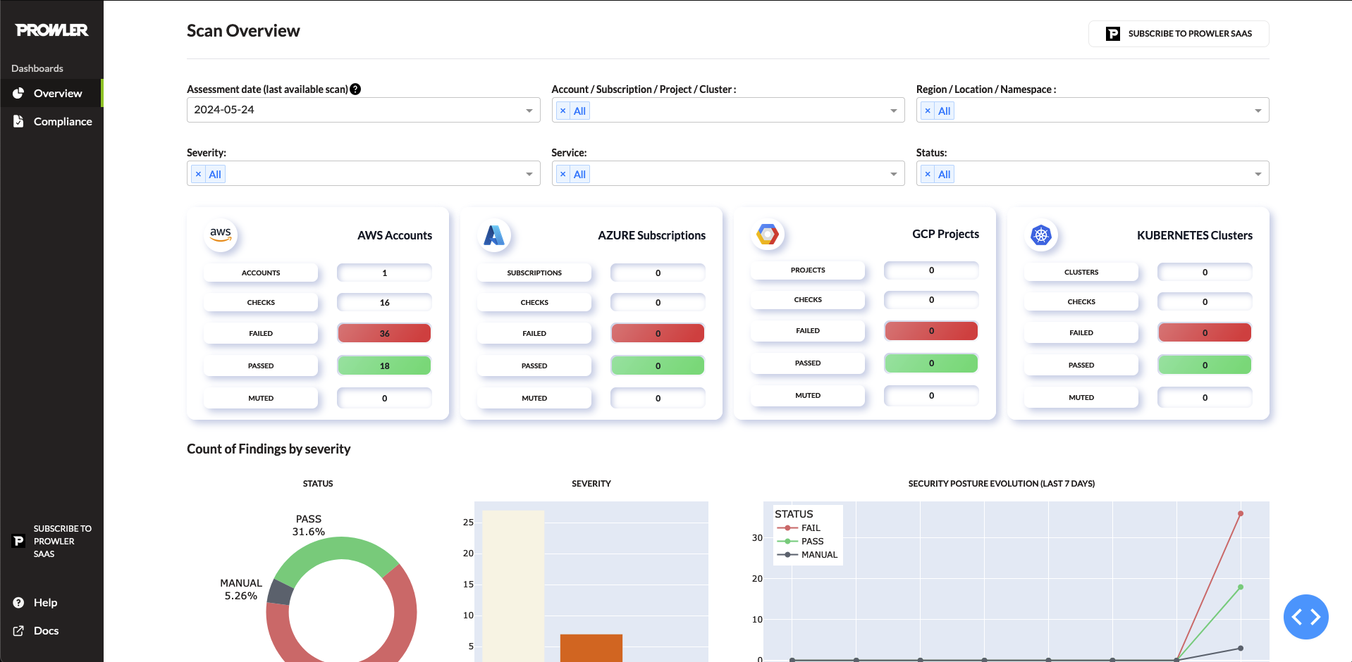 The overview page provides a full impression of your findings obtained from Prowler: