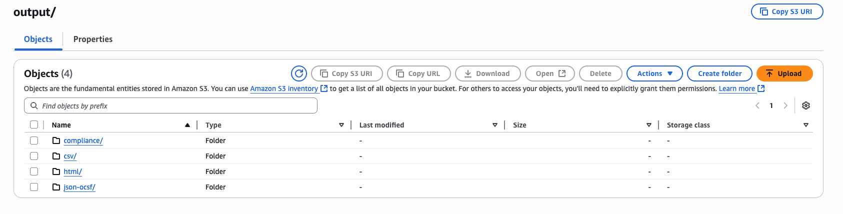 When the S3 integration is enabled and a scan completes, Prowler creates a folder inside the specified bucket path (usingoutput as the default folder name) with subfolders for each output format:
