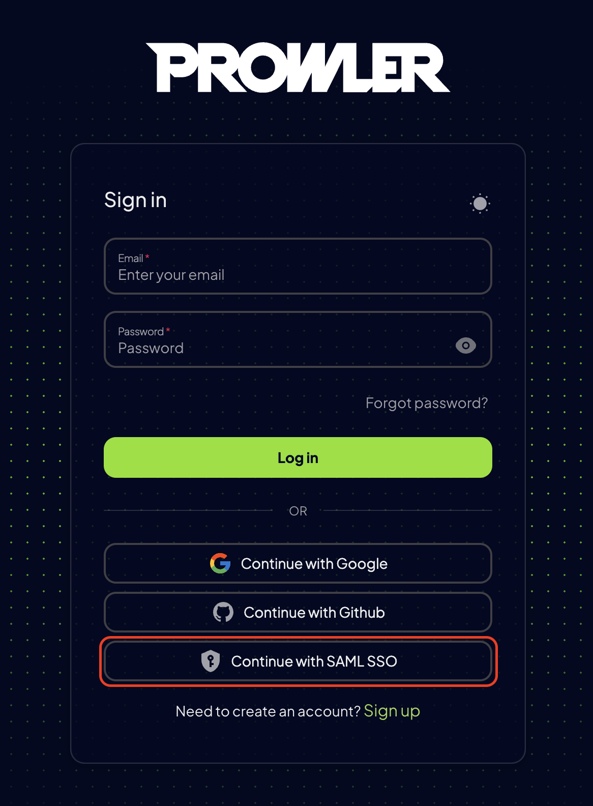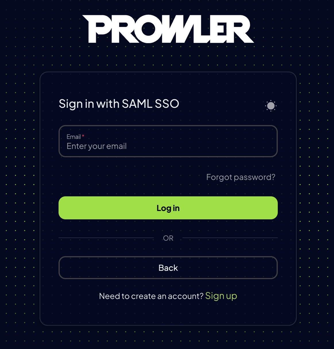 Users can also initiate the login process directly from Prowler’s login page:- Navigate to the Prowler login page